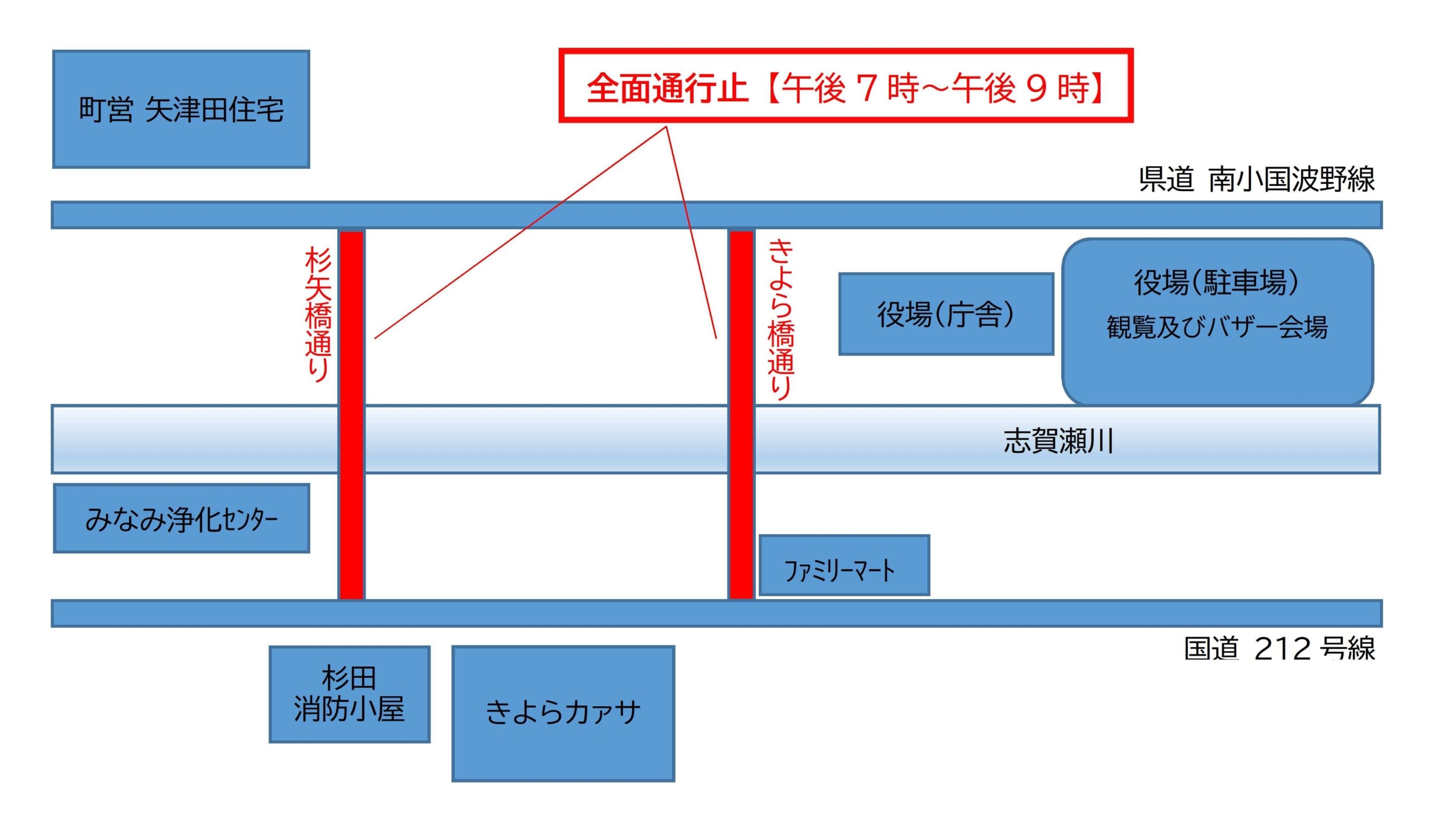 なお、当日は午後7:00から花火終了までの間、県道南小国波野線「きよら橋通り」、並びに町道矢津田杉田線「杉矢橋通り」が全面通行止めとなりますので、ご注意いただきますとともに、会場周辺では誘導員の指示に従い通行してください。ご迷惑をおかけしますが、ご理解、ご協力をお願いいたします。