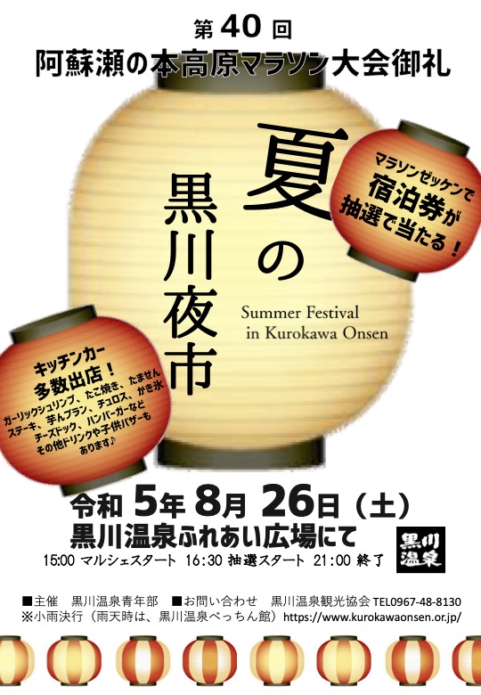 8月26日(土)黒川夜市も開催されます。 2023年08月11日 大草原の中を走り切った後のお楽しみ。夏の黒川夜市が開催🎊 黒川温泉ふれあい広場にてたくさんの魅力的なキッチンカー🚚が集まります! 走った方も走らなかった方も黒川の夏の夜をぜひお楽しみください!! CATEGORY イベント施設・旅館お知らせ ARCHIVE 月を選択 2025年12月 (2) 2025年10月 (2) 2025年9月 (3) 2025年8月 (2) 2025年7月 (2) 2025年6月 (1) 2025年4月 (3) 2025年3月 (1) 2024年12月 (4) 2024年11月 (1) 2024年10月 (4) 2024年9月 (2) 2024年8月 (4) 2024年7月 (1) 2024年6月 (4) 2024年4月 (5) 2024年3月 (1) 2024年2月 (3) 2023年12月 (6) 2023年11月 (1) 2023年10月 (7) 2023年9月 (7) 2023年8月 (2) 2023年7月 (2) 2023年5月 (2) 2023年4月 (3) 2023年3月 (2)