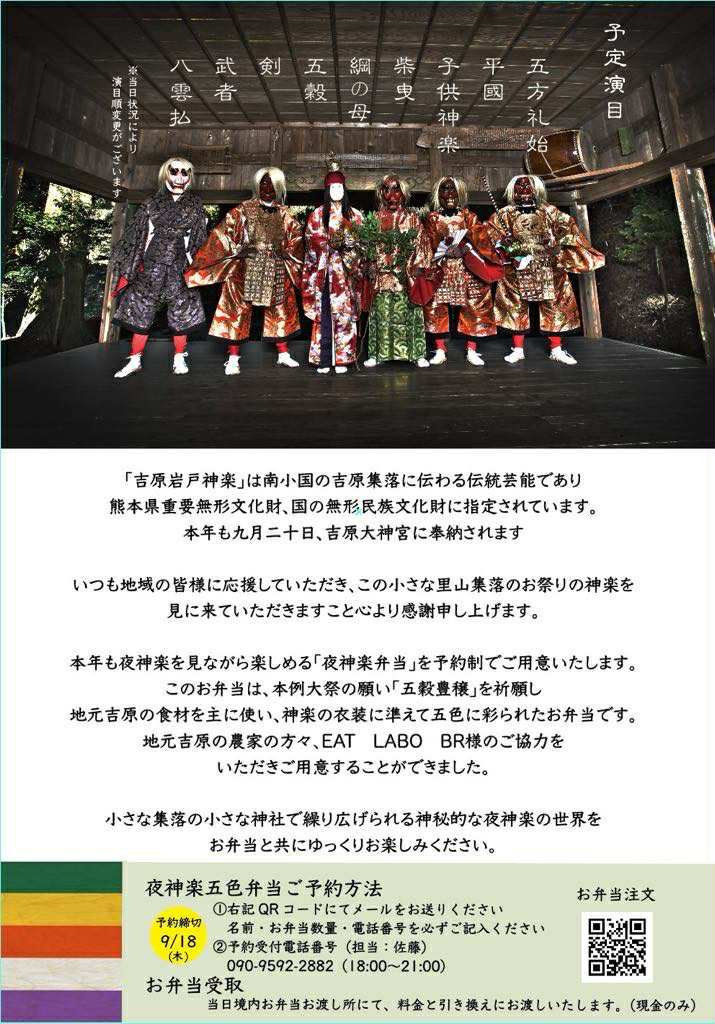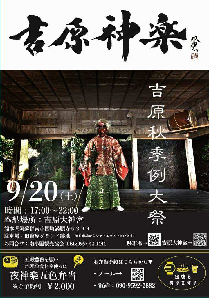 小さな山里に受け継がれる伝統の神楽と、地元の恵みを活かしたお弁当をぜひご一緒にお楽しみください。皆さまのご来場を心よりお待ちしております。