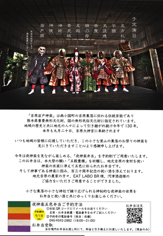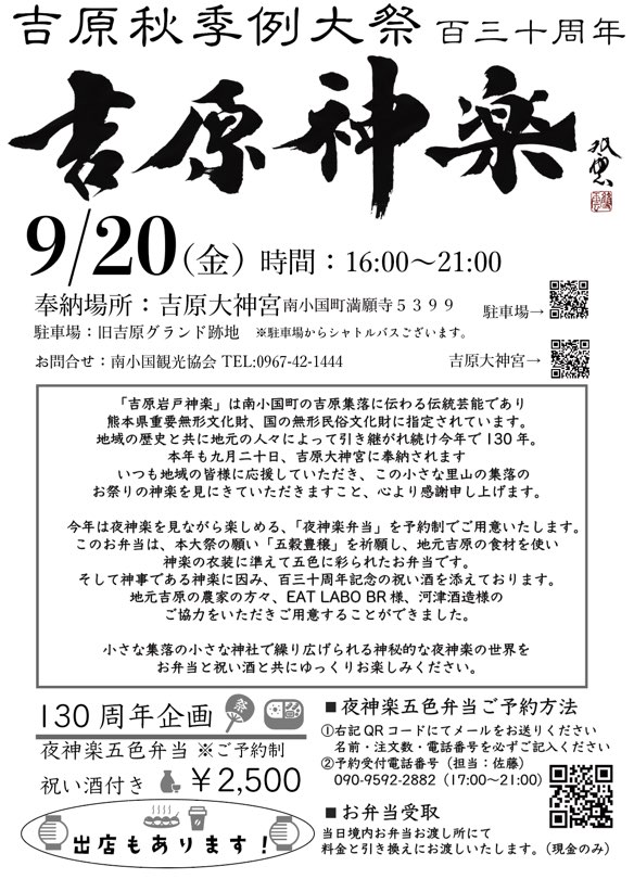 今年で130周年を迎える吉原神楽の秋季例大祭が9月20日16時〜21時にて開催されます。奉納場所は吉原大神宮。出店なども予定されております。