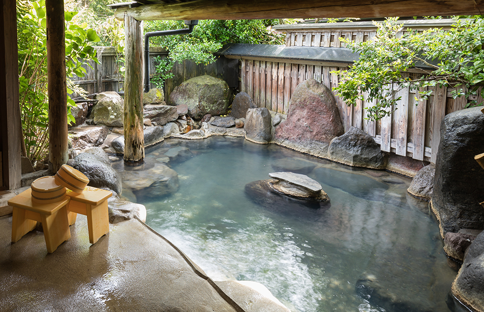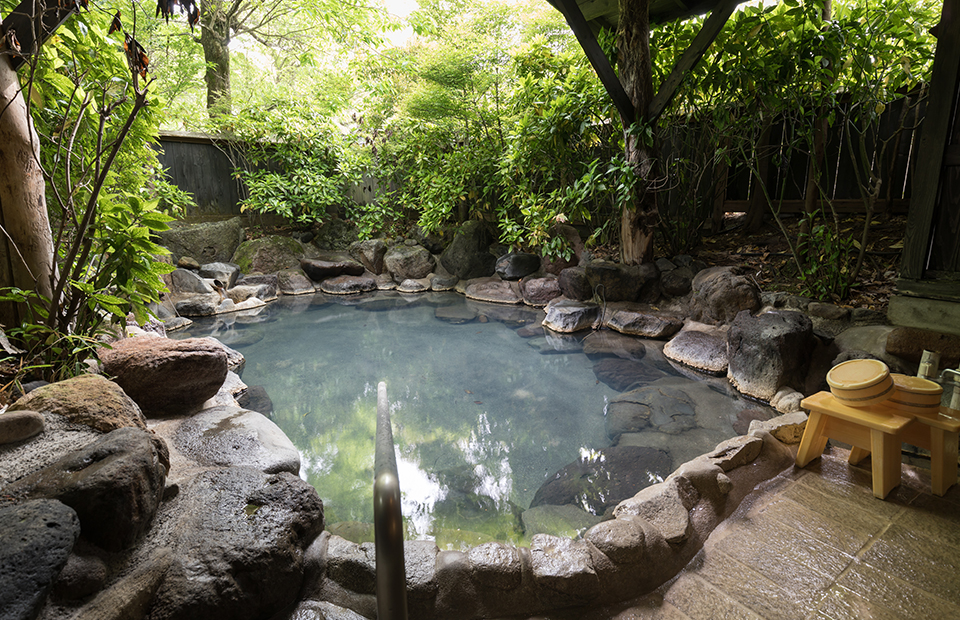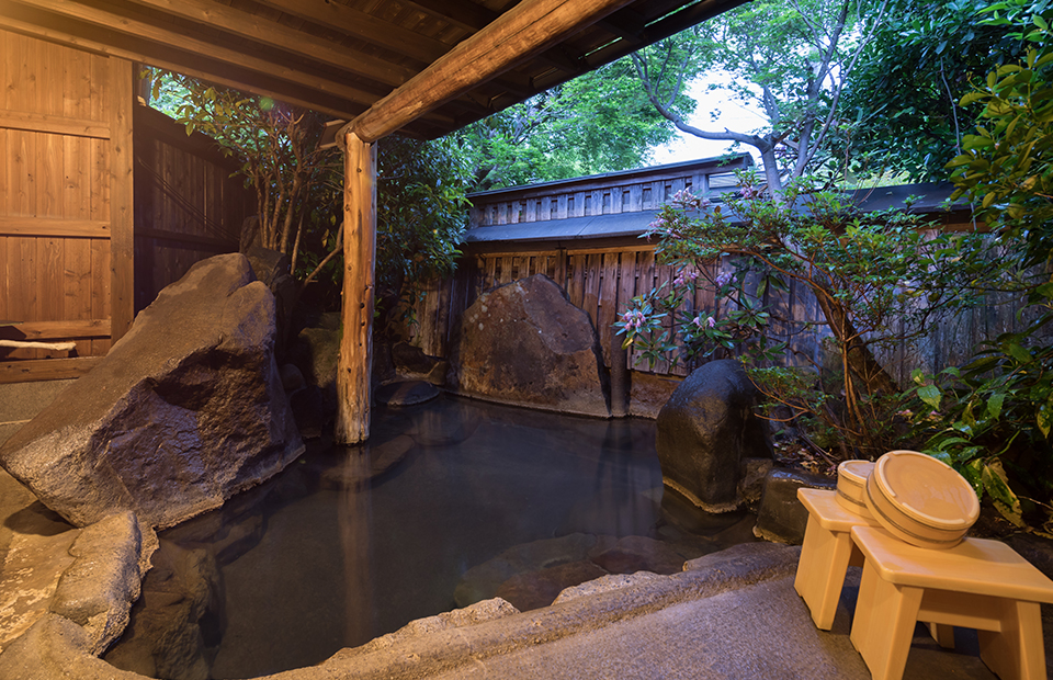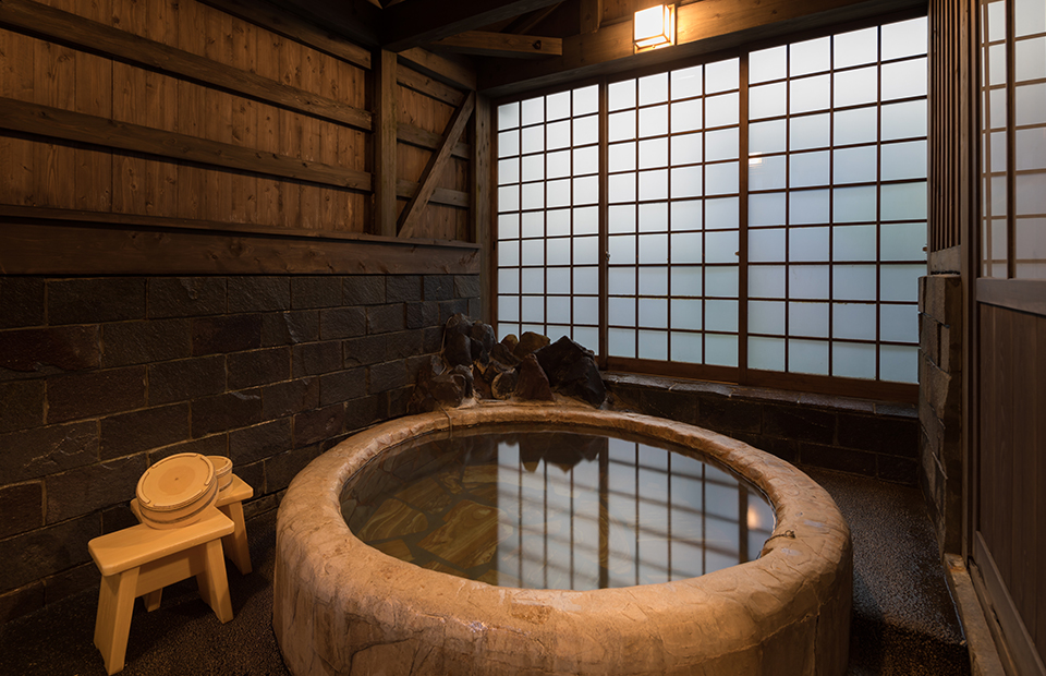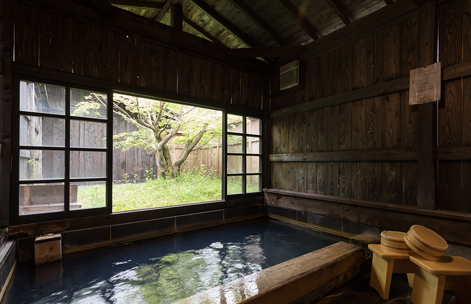 お昼は本格そばを味わう「蕎麦処」、夜は1日4組限定、5つの貸し切り湯処を楽しむ温泉旅館。